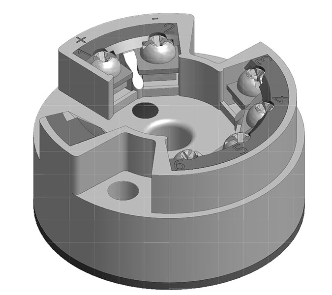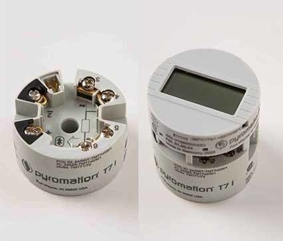 The T71 programmable RTD/thermocouple temperature transmitter is a two-wire transmitter with an analog output. It has measurement input for resistance thermometers (RTDs) in 2-, 3- or 4-wire connections, thermocouples, and voltage signals. Setting up of the transmitter is done using the communication cable. This transmitter is available with or without a digital display, and can be mounted in a direct or remote general-purpose aluminum screw-cover housing. Certain configurations are specified with CSA-rated Intrinsically Safe and Explosion-Proof approvals for Hazardous Locations. These small units can be mounted in Pyromation DIN (Form B) connection heads or they can be used for surface mounting using a 35 mm DIN rail mounting clip.
